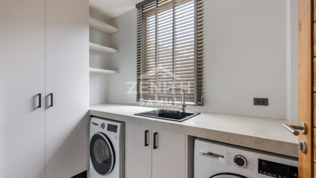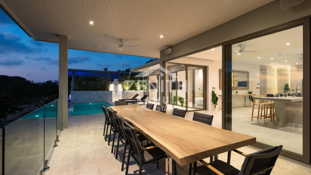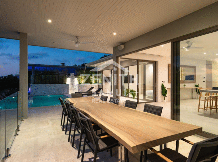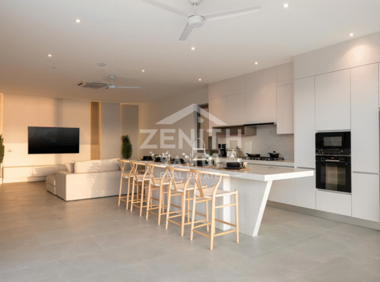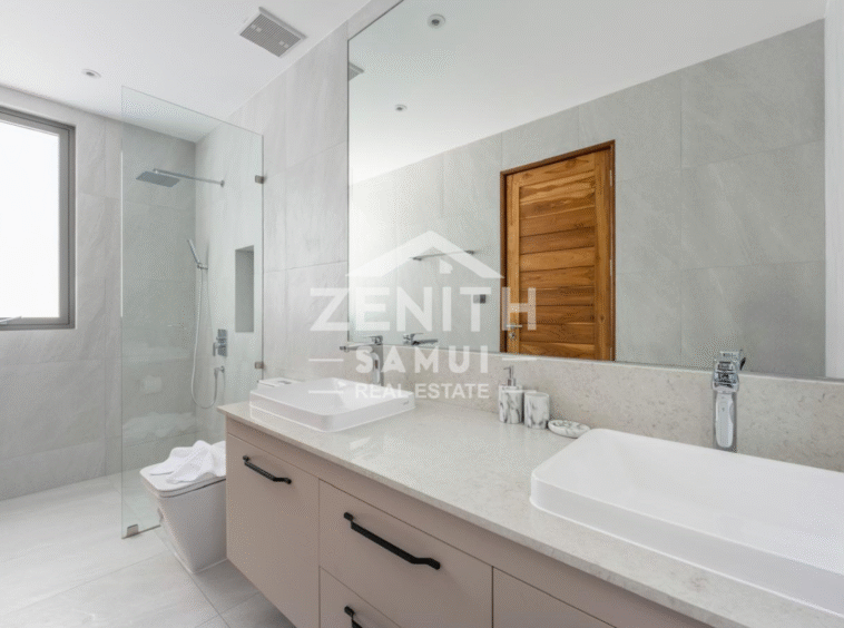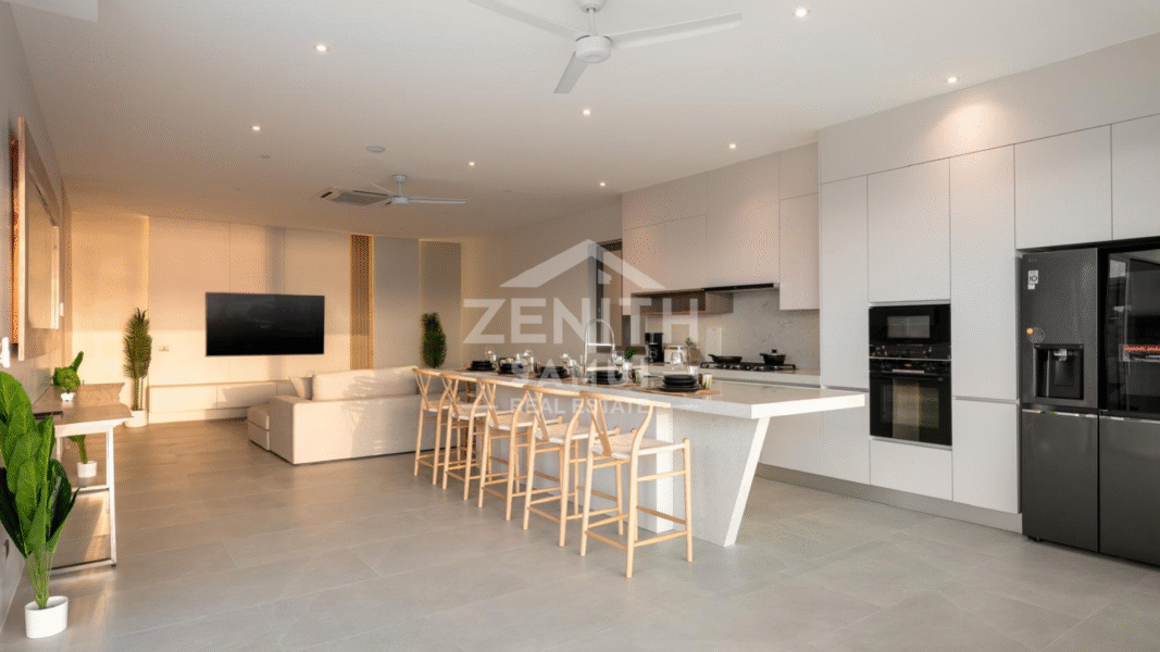 The villa features four spacious bedrooms, each with a modern en-suite bathroom, as well as an elegant living room and open-plan kitchen. The bright living spaces are designed for a seamless transition between the indoors and outdoors, allowing you to fully enjoy the views and tropical climate. The bedrooms are equipped with air conditioning for optimal comfort.