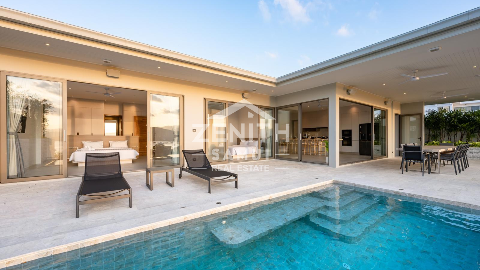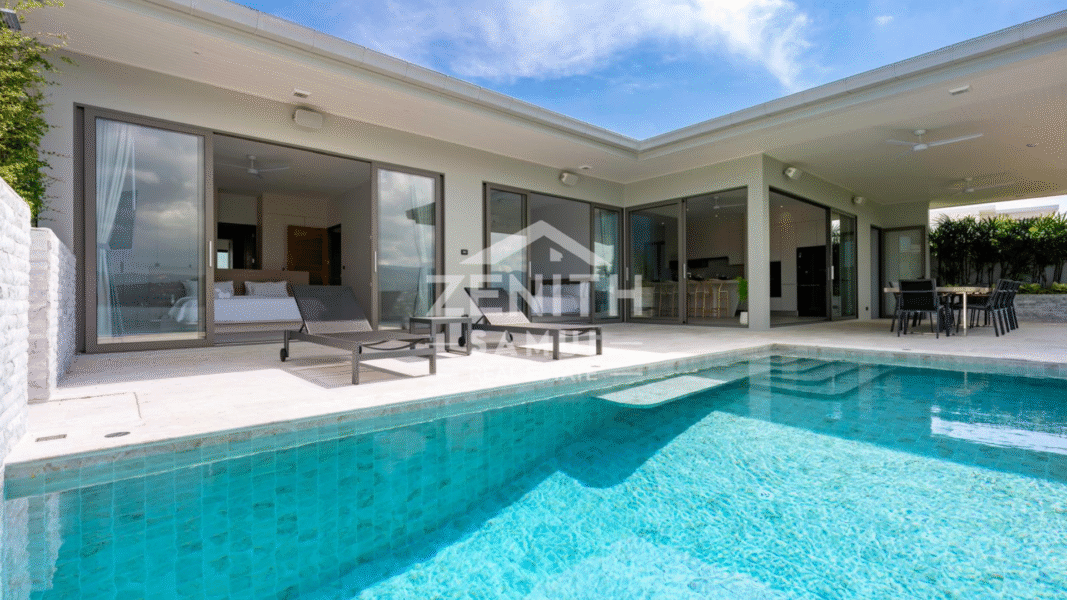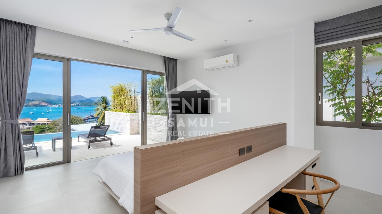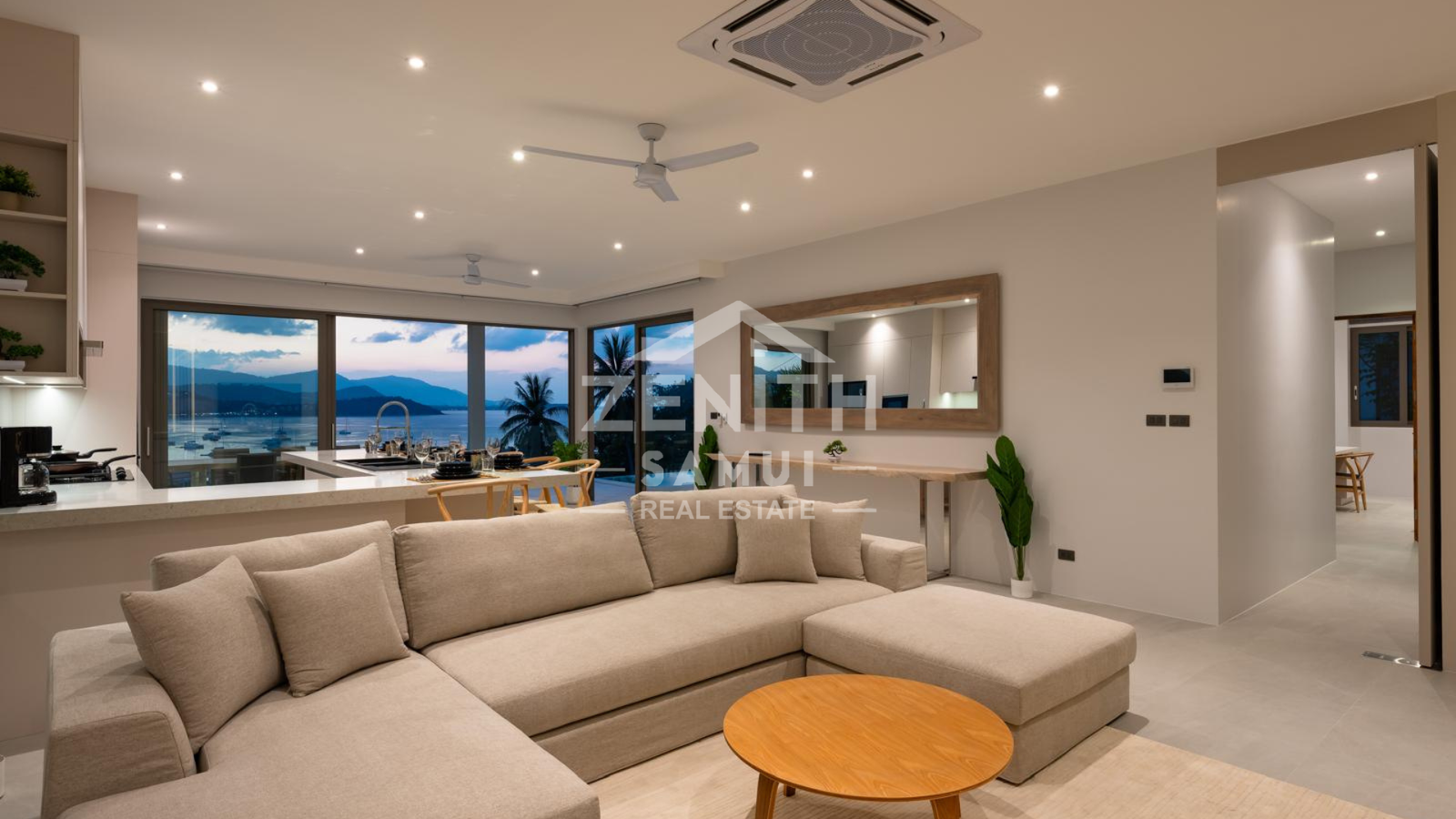 The villa features four spacious bedrooms, each with a modern en-suite bathroom, as well as an elegant living room and open-plan kitchen. The bright living spaces are designed for a seamless transition between the indoors and outdoors, allowing you to fully enjoy the views and tropical climate. The bedrooms are equipped with air conditioning for optimal comfort.