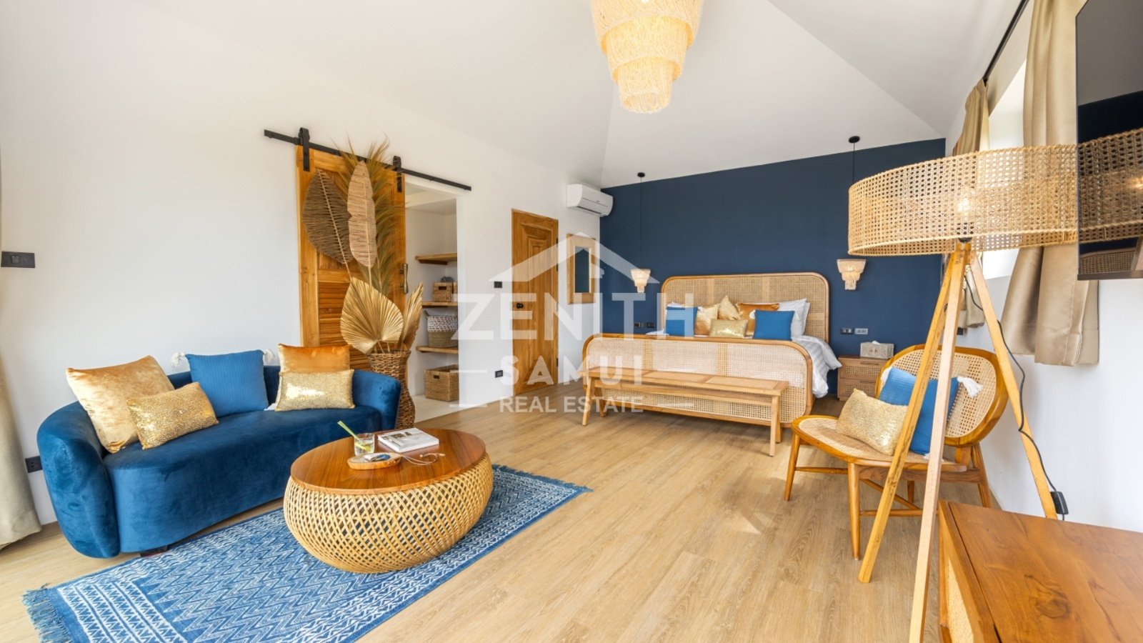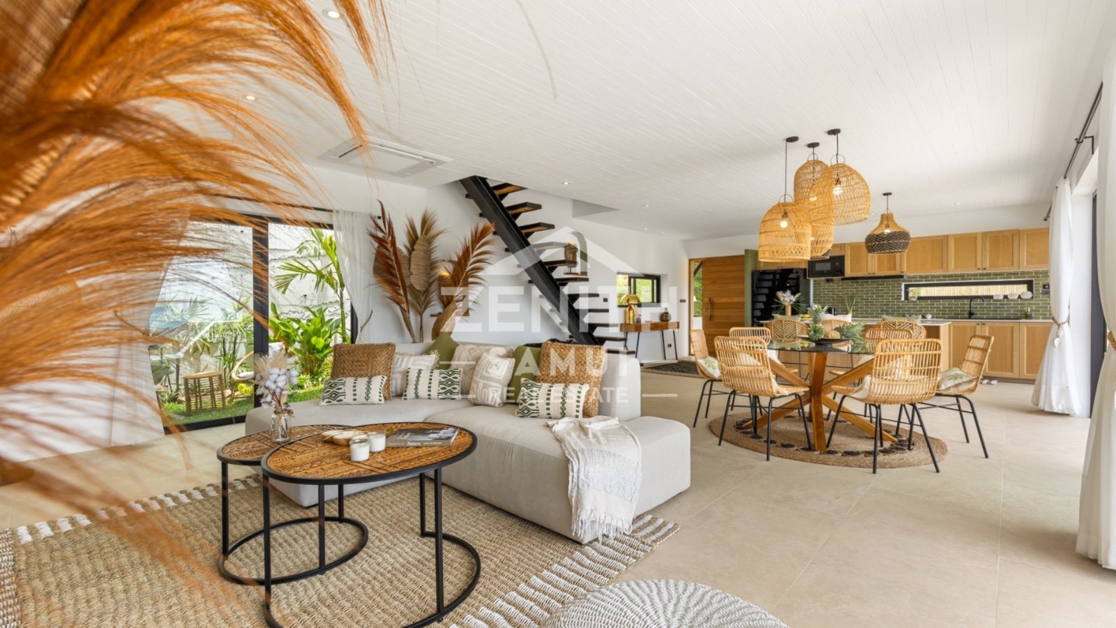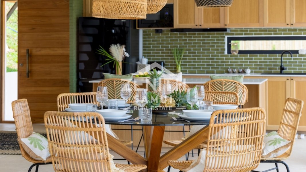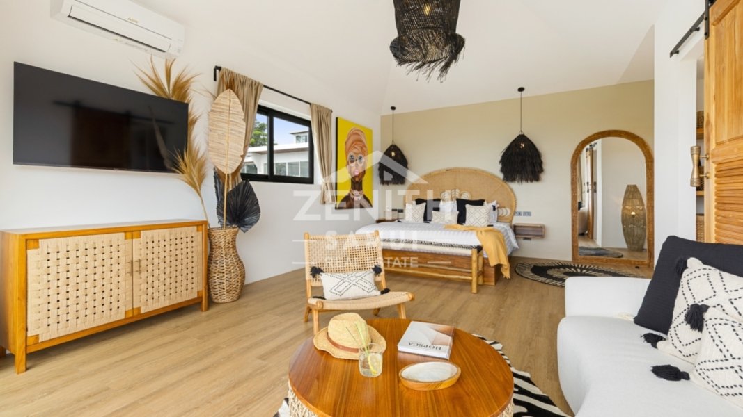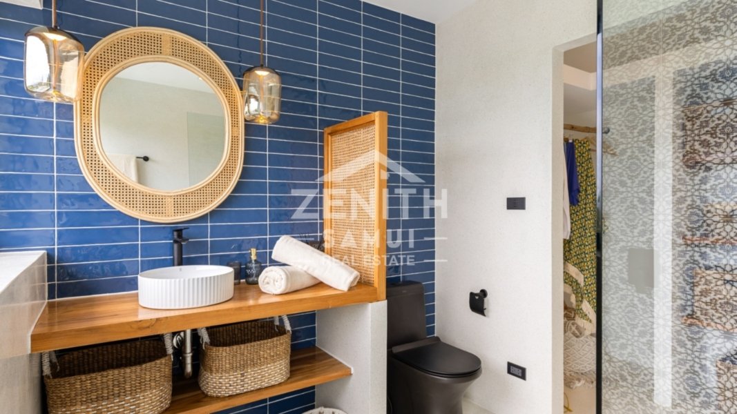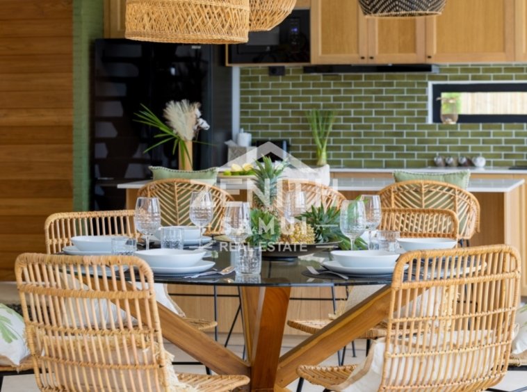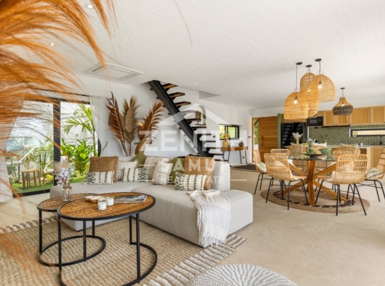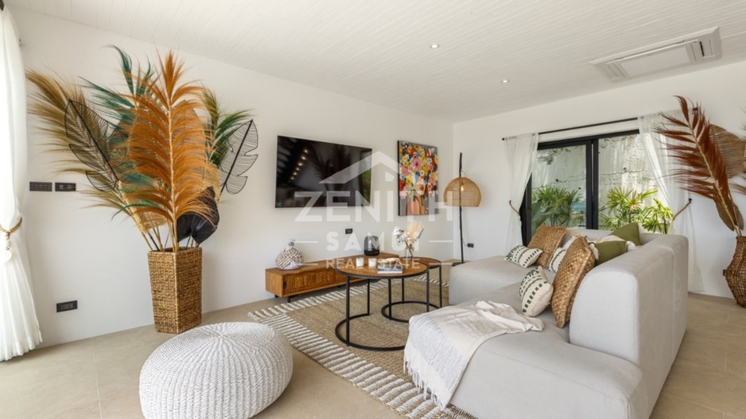 The property features three spacious bedrooms, including two master suites, designed to provide comfort and elegance in every detail. The interiors are styled in a tasteful Bali-inspired aesthetic, combining high-end finishes with warm tropical touches. The villa is sold fully furnished and ready to move in.