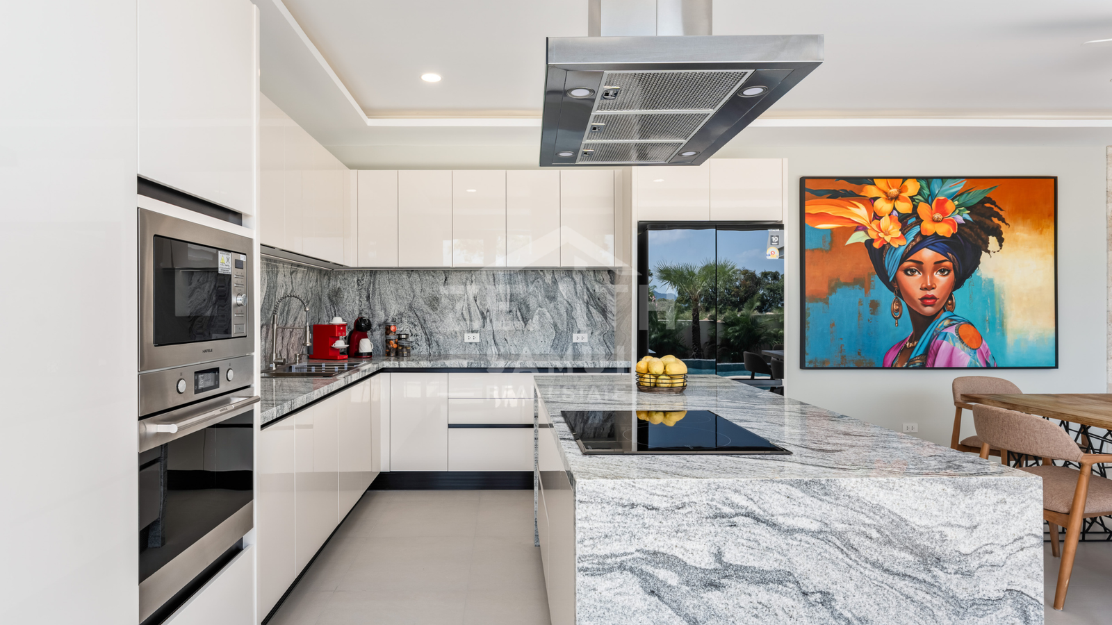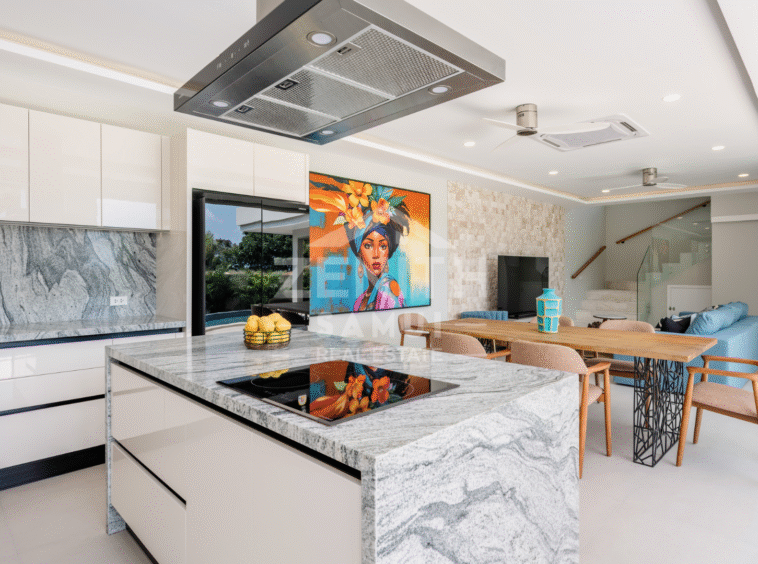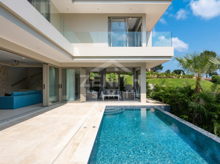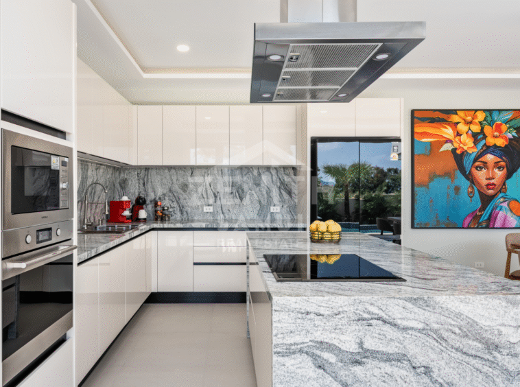 The villa features three bedrooms, each with its own en-suite bathroom, as well as a bright open-plan living area with large floor-to-ceiling glass doors opening onto the terrace and pool. The layout has been carefully designed to ensure a seamless transition between indoor and outdoor spaces, in a modern and functional style. A fully equipped contemporary kitchen with high-end appliances, a private laundry room, and a guest WC complete the interior.